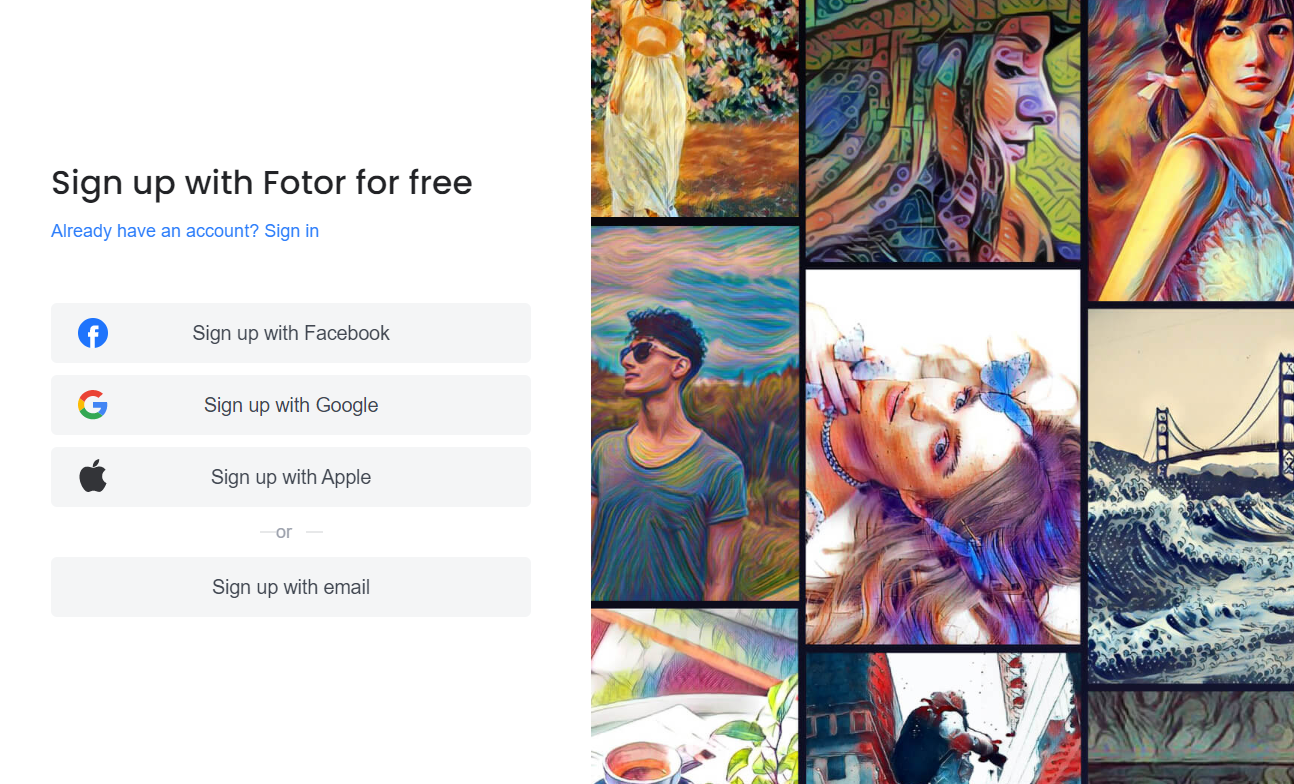 Шаг 1: Вам обязательно нужно войти в систему, создать учетную запись на официальном сайте Fotor. Вы можете войти в систему, используя существующую учетную запись Google, Facebook, Apple или электронную почту.