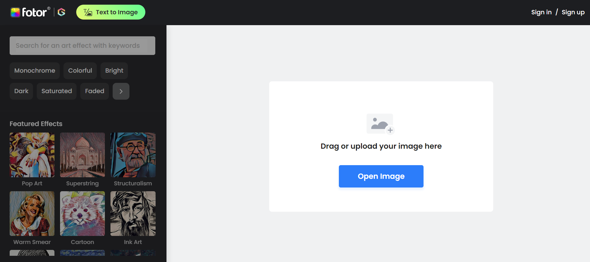 Fotor Go Art — генератор искусств на основе искусственного интеллекта, который приобрел популярность. Основанный в 2014 году, он превратился из приложений для загрузки фотографий в удобную структуру искусственного интеллекта, которая предлагает различные функции для расширения изображений. Fotor Go Art продолжает использовать свои возможности для извлечения фотографий в своем инструменте искусственного интеллекта и использует создание изображений на основе файлов с помощью подсказок извлечения текста в изображение.